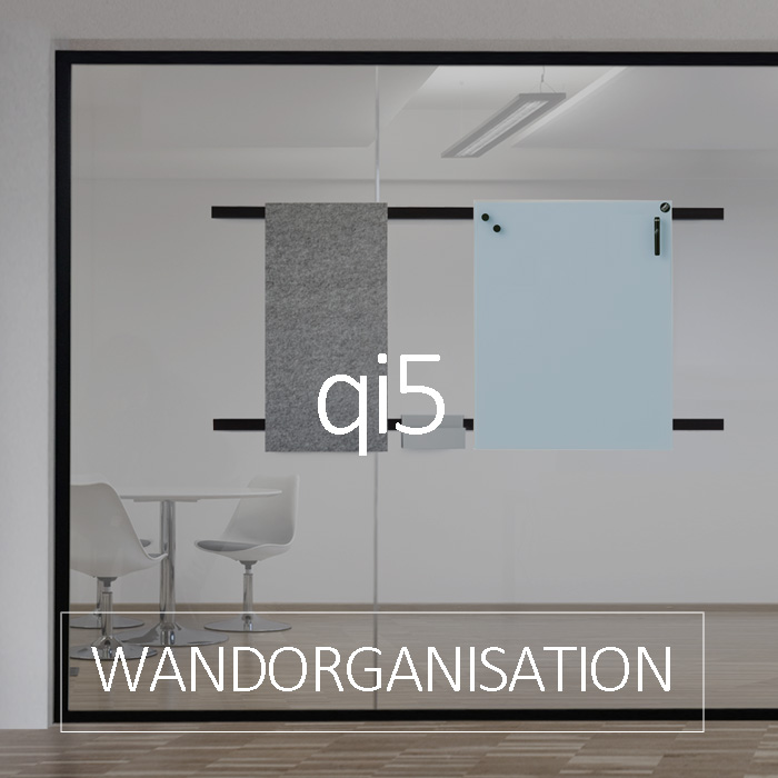 Wie an einer Shakerleiste kann an der qi5 Wandleiste eine magnetische Glastafel oder ein Absorber eingehängt werden. Die Montage der Wandleiste ist an Glaswänden oder an Vollwänden möglich. In Zeiten von digitalen Medien bleibt das haptische Medium Schreibtafel ein wichtiger Begleiter.