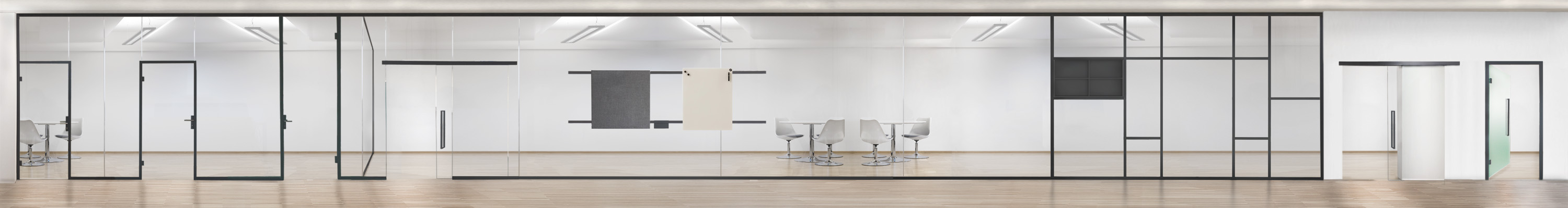 Das Glastrennwandsystem qi1 lässt sich an die Gestaltungsanforderungen der Architektur und Innenarchitektur anpassen und ist Werkzeug für die Ideen der Architekten. Raumakustische Lösungen qi8 mit frei gestaltbaren, bedruckbaren Oberflächen bieten eine unbegrenzte Variantenvielfalt.